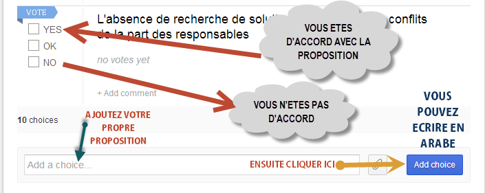 Depuis quelques jours j'ai fustigé les animateurs à causes des conflits qui sont devenus "mode", Maintenant je passe à l'action (pour ne pas rester dans "les mots") et je vous propose de réfléchir ensemble aux causes et aux solutions et cela sous forme d'un VOTE. je vous propose déjà dix causes, vous pouvez rajouter d'autres si vous le voulez, comme vous pouvez commenter les "causes" proposées. Il s'agit de collecter le maximum de réactions pour une synthèse fiable que nous pouvons proposé aux Responsables.